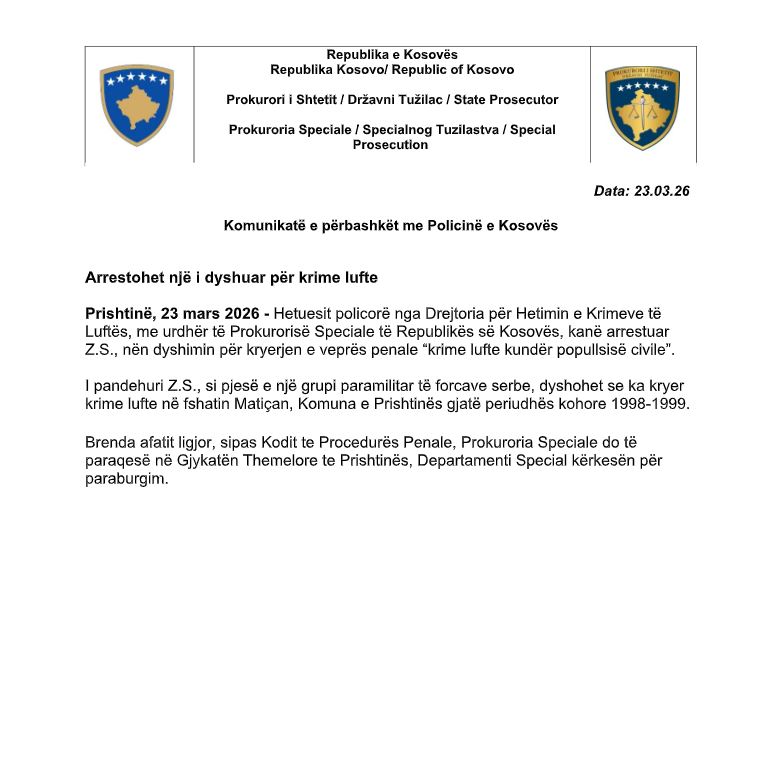 Prokuroria Speciale e Kosovës ka njoftuar se hetuesit policorë nga Drejtoria për Hetimin e Krimeve të Luftës, kanë arrestuar Z.S., nën dyshimin për kryerjen e veprës penale “krime lufte kundër popullsisë civile”, transmeton KosovaPost.