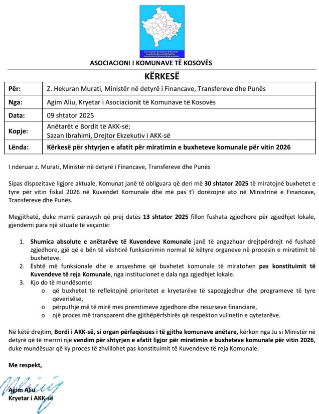 Bordi i Asociacionit të Komunave të Kosovës (AKK) i është drejtuar me kërkesë Ministrit në detyrë të Financave, Transfereve dhe Punës, Hekuran Murati, për shtyrjen e afatit ligjor për miratimin e buxheteve komunale për vitin 2026.