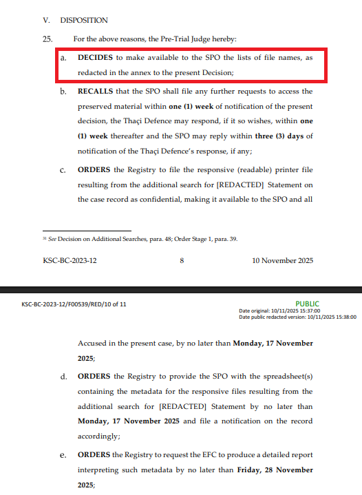 “Më 8 shtator 2025, me kërkesë të Zyrës së Prokurorit të Specializuar (“ZPS”), Gjykatësi i Procedurës Paraprake autorizoi disa kontrolle (shtesë) forenzike mbi materialet e ruajtura nga printerët dhe kompjuterët që (pretendohet se) janë përdorur nga dhe/ose kanë qenë të qasshme për Hashim Thaçin (“z. Thaçi”) në Qendrat e Paraburgimit të Dhomave të Specializuara. Specifikisht, Gjykatësi i Procedurës Paraprake autorizoi kryerjen e kontrolleve të mëtejshme nga një kompani e jashtme forenzike (“KJF”)”, citohet në një shkresë, të nxjerrur nga gjyqtarja e procedurës paraprake, Marjorie Masselot në rastin ku Thaçi akuzohet për ndërhyrje në drejtësi.