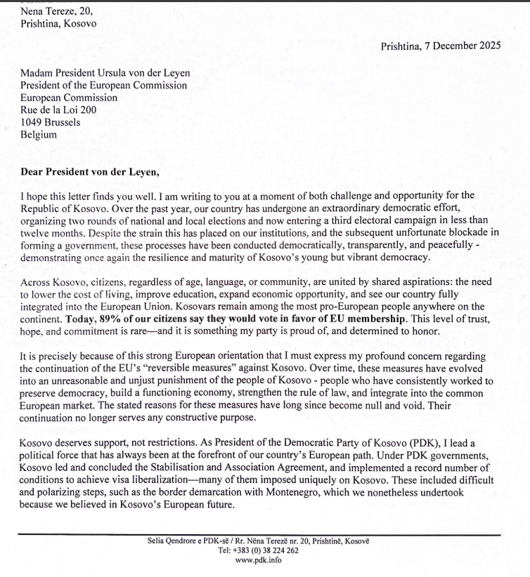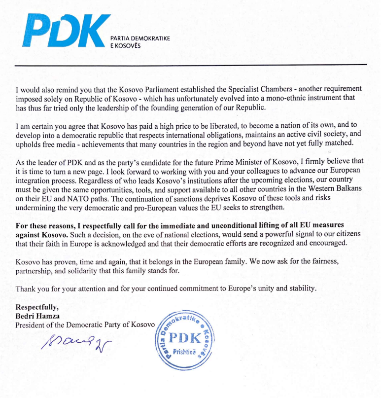 Kreu i PDK-së, Bedri Hamza, i ka dërguar një letër Presidentes së Komisionit Evropian, Ursula von der Leyen, ku kërkon heqjen e menjëhershme dhe të pakushtëzuar të masave të BE-së ndaj Kosovës. Ai argumenton se Kosova ka vepruar në përputhje me të gjitha standardet demokratike dhe ka bërë sakrifica të mëdha në procesin e integrimit evropian.