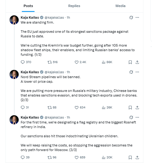 Kryediplomatja e Bashkimit Evropian, Kaja Kallas, ka njoftuar se është miratuar paketa e re e sanksioneve ndaj Rusisë. Ajo e ka cilësuar këtë si një nga paketat më të fuqishme deri sot.