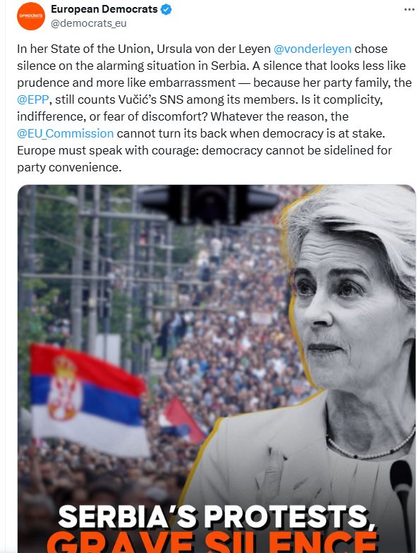 Demokratët Evropianë kanë reaguar pas fjalimit të Presidentes së Komisionit Evropian, Ursula von der Leyen, duke e akuzuar atë për heshtje ndaj gjendjes alarmante në Serbi.