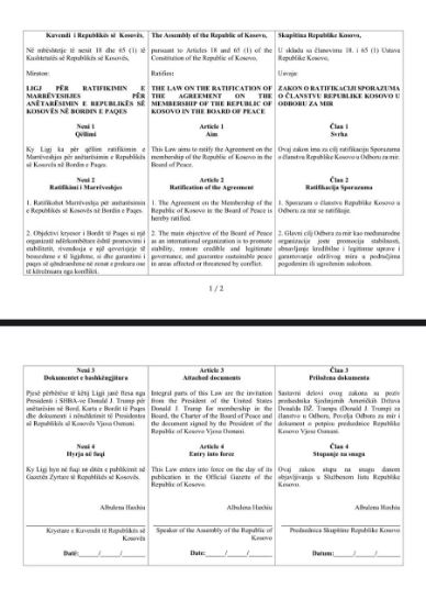 Komisioni për Punë të Jashtme dhe Diasporë i Kuvendit të Kosovës është mbledhur sot në një mbledhje ku po shqyrtohet projektligji për ratifikimin e Marrëveshjes për anëtarësimin e Republikës së Kosovës në Bordin e Paqes.