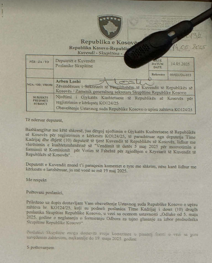 “Bashkëngjitur me këtë shkresë, ju dërgoj njoftimin e Gjykatës Kushtetuese të Republikës së Kosovës për regjistrimin e kërkesës KO124/25, të parashtruar nga deputetja Time Kadrijaj dhe dhjetë (10) deputetë të tjerë të Kuvendit të Republikës së Kosovës, lidhur me vlerësimin e kushtetutshmërisë së ‘Vendimit të datës 5 maj 2025 për mosvotimin e formimit të Komisionit për Votim të Fshehtë për zgjedhjen e Kryetarit të Kuvendit të Republikës së Kosovës’. Deputetët e Kuvendit mund t’i parashtrojnë komentet e tyre me shkrim, nëse kanë lidhur me kërkesën e lartcekur, jo më vonë se më 19 maj 2025”, thuhet në këtë shkresë.