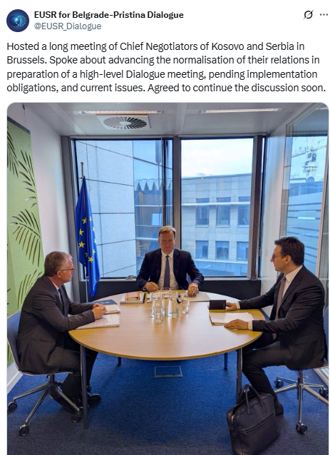 “Isha mikpritës i një takimi të gjatë në Bruksel mes kryenegociatorëve të Kosovës dhe Serbisë. Diskutuam lidhur me avancimin e normalizimit të raporteve të tyre në përgatitje të një takimi të nivelit të lartë të dialogut, për zbatimin e obligimeve dhe çështjet aktuale. U pajtuam që së shpejti të vazhdojmë diskutimin”, shkroi ai në X.