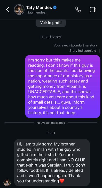 “Më vjen vërtet keq. Vëllai im ka stufiuar në Milano me një djalë i cili ia ka bërë dhuratë fanellën. Ke të drejt plotësisht dhe nuk ia kisha idenë që kjo fanellë ishte e Serbisë pasi unë sinqerisht nuk e përcjell futbollin. Tashmë është fshirë fotoja dhe nuk do të ndodhë më në të ardhmen. Faleminderit për mirëkuptimin”, shkroi ajo, duke iu përgjigjur një komentuesit, i cili e kritikoi për foton, ku shihej vëllai i saj me fanellën e Serbisë të veshur.