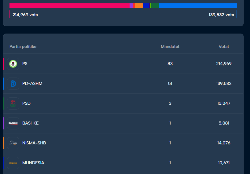 PD-ja me Sali Berishën ka siguruar 726 vota, kurse PS-ja ka 705 vota.