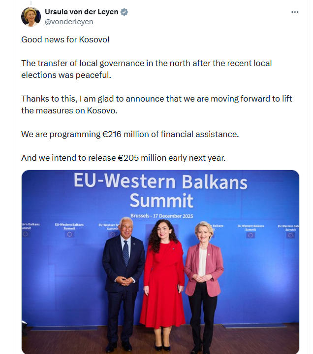 Presidentja e Komisionit Evropian, Ursula von der Leyen, ka reaguar pozitivisht ndaj zhvillimeve të fundit në Kosovë, duke e cilësuar situatën si një lajm të mirë për vendin.