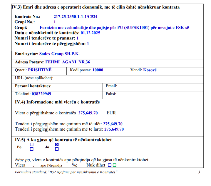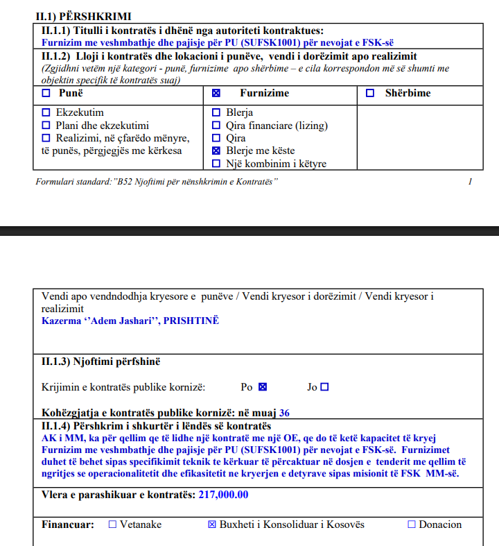 AK i MM-së, ka për qëllim që të lidhë një kontratë me një OE-në, që do të ketë kapacitet të kryejë furnizim me veshmbathje dhe pajisje për PU-në (SUFSK1001) për nevojat e FSK-së. Furnizimet duhet të bëhet sipas specifikimit teknik të kërkuar të përcaktuar në dosjen e tenderit me qëllim të ngritjes se operacionalitetit dhe efikasitetit në kryerjen e detyrave sipas misionit të FSK MM-së.”, thuhet mes tjerash në përshkrimin e shkurtër të kontratës. Kohëzgjatja e kontratës publike kornizë është bërë për 36 muaj.