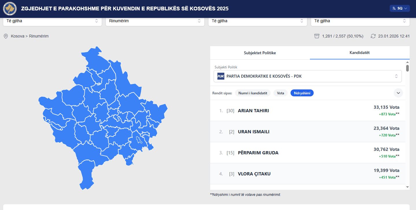 Tahirit deri më tash kur janë rinumëruar mbi 50% e vendvotimeve, i janë shtuar 873 vota.