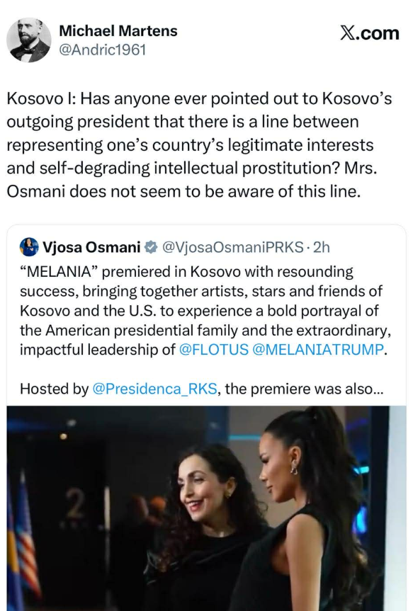 Gazetari gjerman i FAZ, Michael Martens, ka reaguar rreth një postimi të presidentes Vjosa Osmani, ku kjo e fundit ka njoftuar se dokumentari ‘Melania’’ i Melania Trump, ka pasur premierën në Kosovë nën kujdesin e Presidentes.