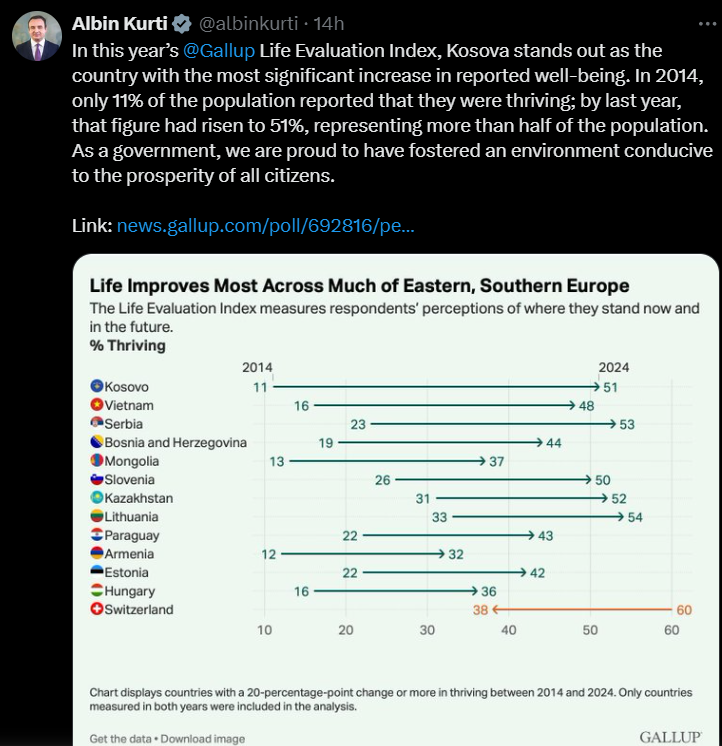 “Në Indeksin e Vlerësimit të Jetës të Gallup të këtij viti, Kosova dallohet si vendi me rritjen më të madhe të mirëqenies së raportuar”, shkroi Kurti në një postim në platformën X.