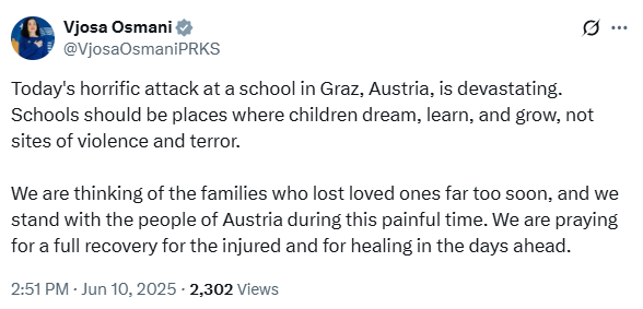 “Sulmi i tmerrshëm i sotëm në një shkollë në Graz të Austrisë është shkatërrues. Shkollat duhet të jenë vende ku fëmijët ëndërrojnë, mësojnë dhe rriten, jo vende dhune dhe terrori. Ne po mendojmë për familjet që humbën të dashurit e tyre shumë herët dhe jemi pranë popullit të Austrisë gjatë kësaj kohe të dhimbshme. Po lutemi për një shërim të plotë për të plagosurit”, ka shkruar Osmani.