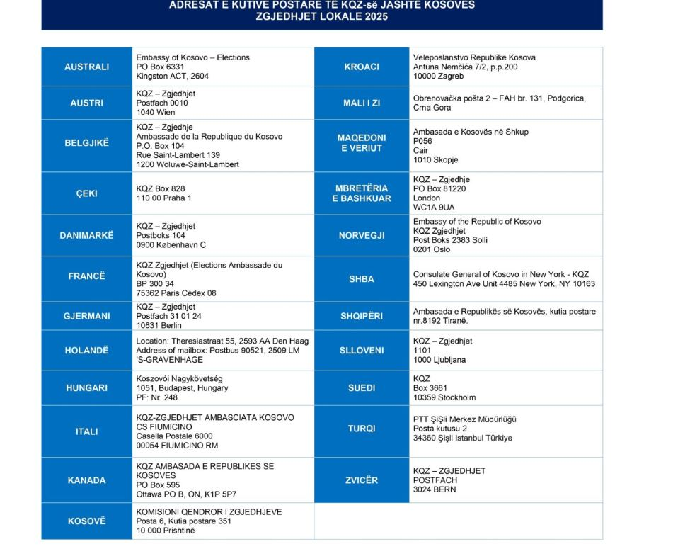 Në përputhje me Rregulloren Zgjedhore Nr. 04/2025 për regjistrimin dhe votimin jashtë Kosovës, KQZ ka përgatitur dhe dërguar pakot me fletëvotime për secilin votues të regjistruar. Çdo zarf përmban fletëvotimin, zarfin e fshehtësisë, udhëzuesin me informacione për plotësimin e fletëvotimit dhe procesin e votimit me postë, si dhe zarfin kthyes me shirit mbyllës.