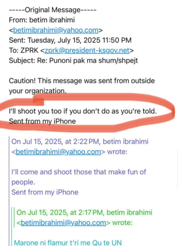 “”Edhe familja jote. Për tradhti. Për ndërrimin e flamurit tonë. Për ndjekjen e njerëzve dhe marrjen e vendimeve bazuar në mendimet e tyre… A janë shenjat në Serbi në të dyja gjuhët, shqip dhe serbisht?””, shkruhet ndër të tjera në emailin e dërguar më 16 korrik në ora 00:15.
