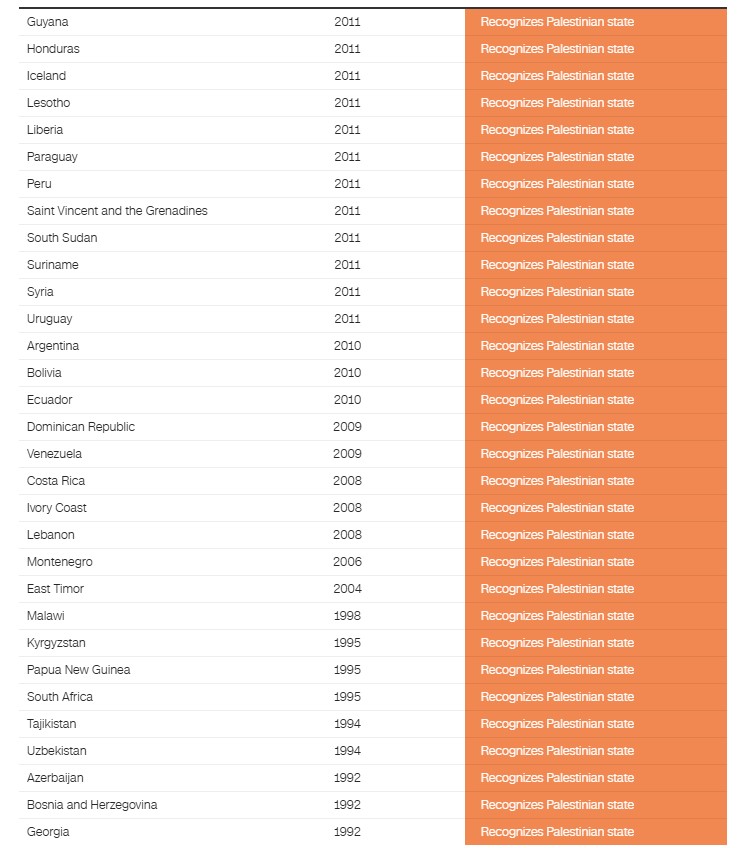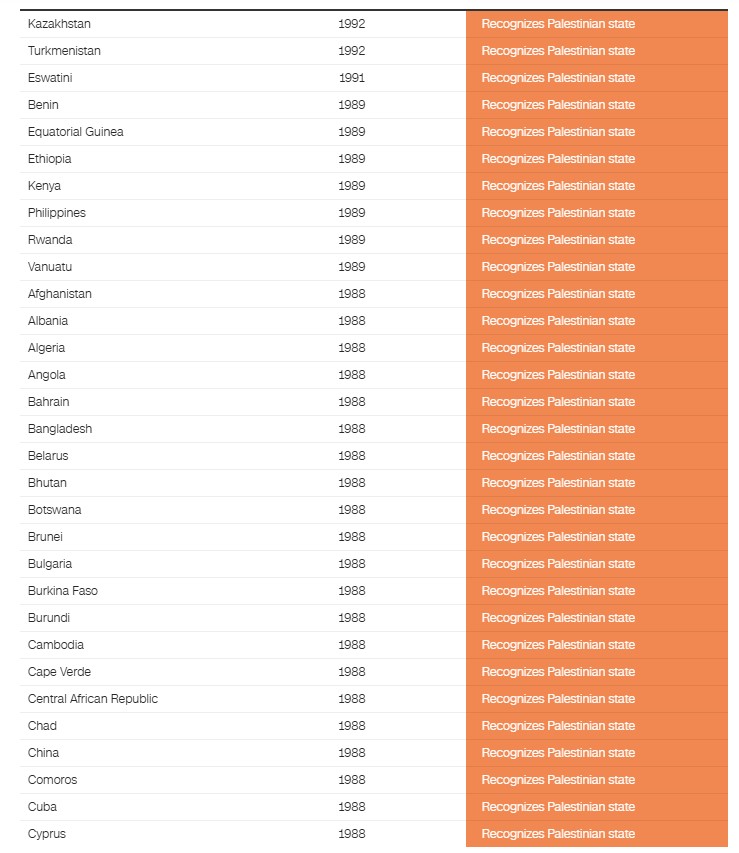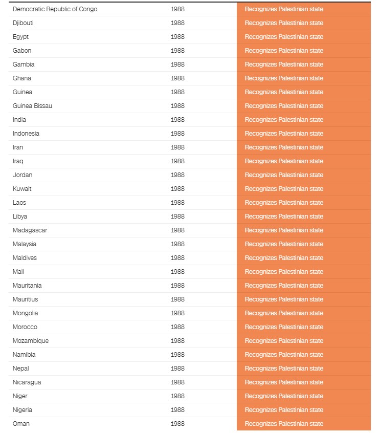 Pjesa më e madhe e këtyre shteteve e kanë njohur zyrtarisht shtetin palestinez që në vitet 1980, menjëherë pas shpalljes së pavarësisë nga ana e Këshillit Kombëtar Palestinez (PNC), i cili është organi përfaqësues i Organizatës për Çlirimin e Palestinës (OÇP).
