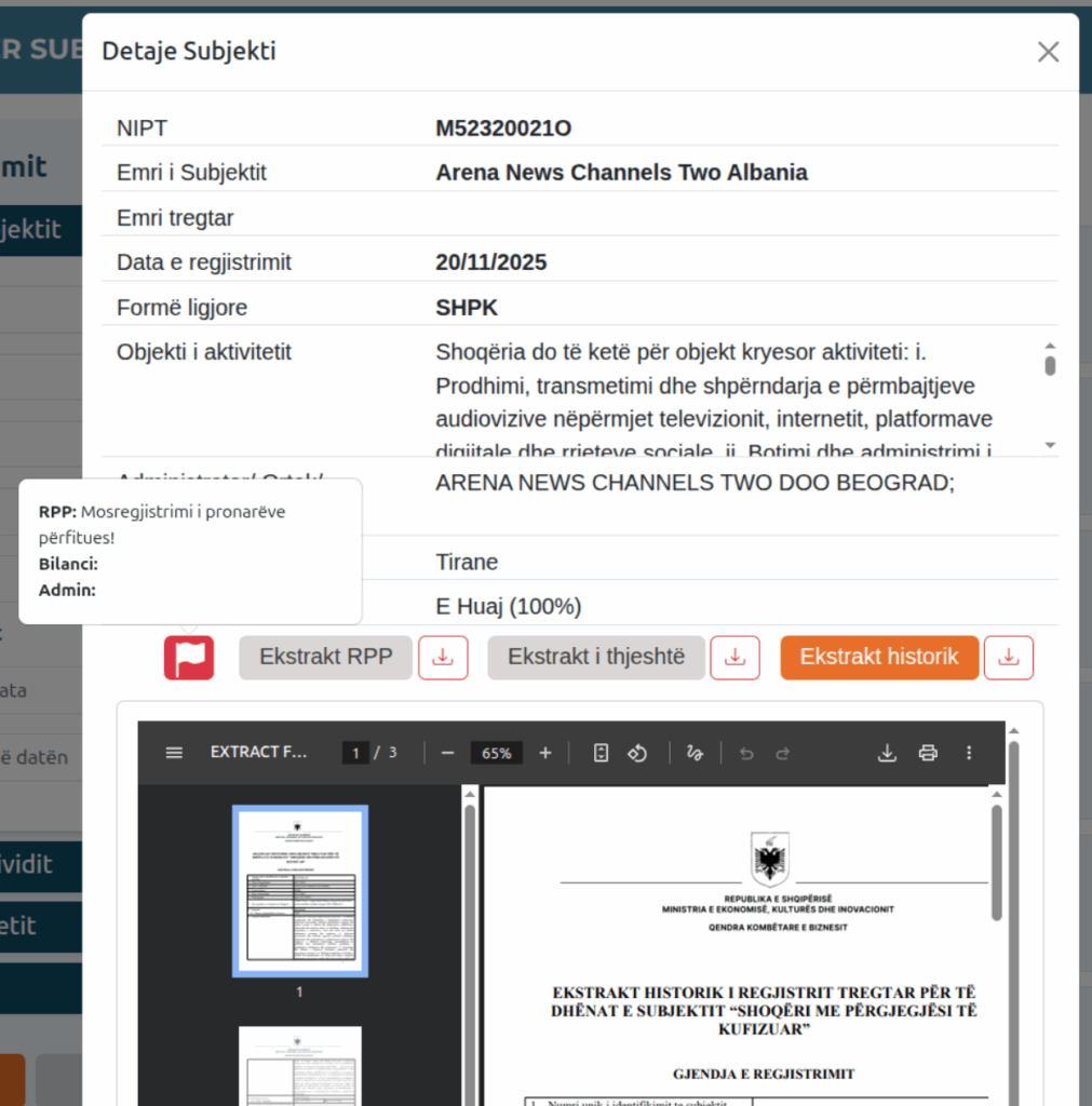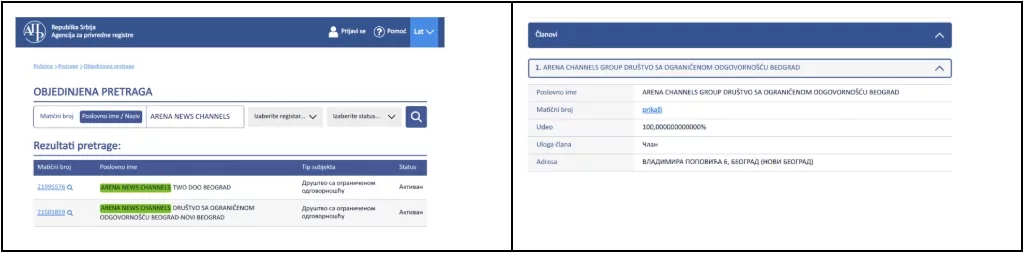 Nga regjistri tregtar serb (APR – Agjensioni për Regjistra Tregtar) shofim se “ARENA NEWS CHANNELS TWO DOO BEOGRAD” është një shpk e regjistruar në Serbi më 13.03.2024, me numër amëz: 21995576 e me pronarë të vetëm shoqërinë serbe: “ARENA CHANNELS GROUP DOO BEOGRAD” (numri amëz: 20510293).