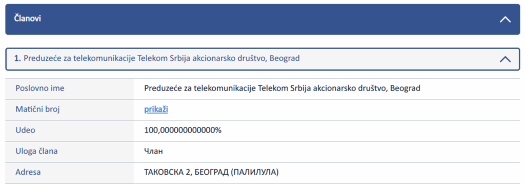 Kurse, kjo e fundit, “ARENA CHANNELS GROUP DOO” (20510293), është në pronësi të plotë nga Telekom Srbija AD.