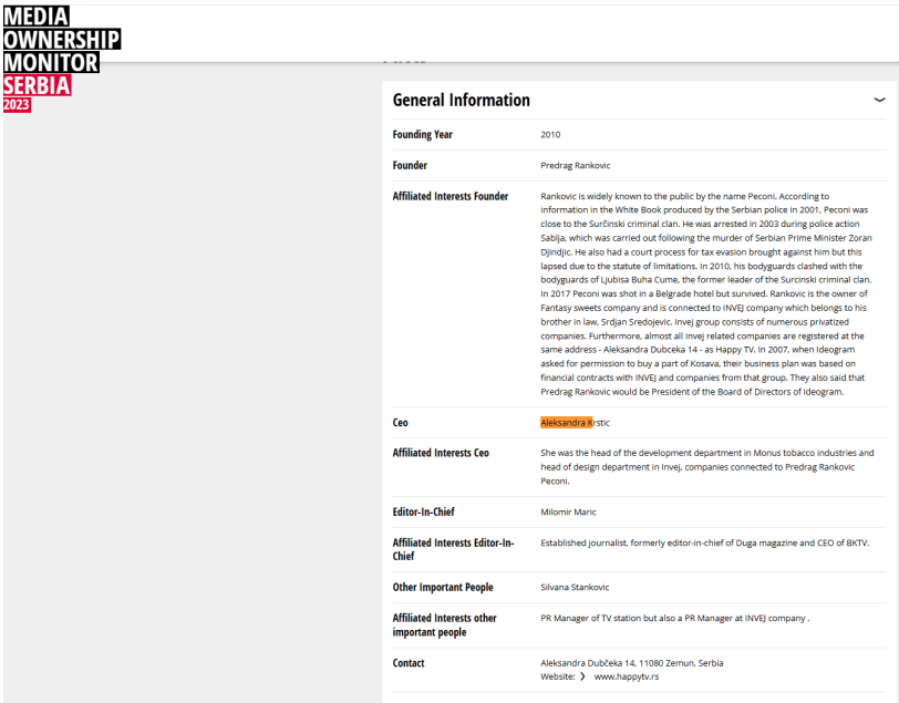 Kurse, drejtor i kompanisë amë në Beograd është znj. Aleksandra Krsić (Alleksandra Kërstiq), e cila sipas këtij artikulli në Media Ownership Monitor Serbia, është një ish-drejtuese në televizionin “Happy” – një shtëpi mediale derivat i “TV Košava”-s (TV Koshava) të Maria Milošević (Millosheviq), vajzës së kasapit të Ballkanit Sllobodan Millosheviq.