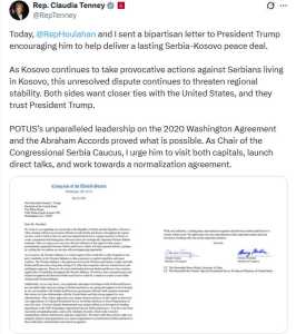 Dy kongresiste amerikane, Claudia Tenney dhe Chrissy Houlahan, i kanë drejtuar një letër Presidentit amerikan Donald Trump, ku i kërkojnë që të ndërmjetësojë në një marrëveshje për njohje reciproke mes Kosovës dhe Serbisë. Letra është publikuar nga vetë Tenney në rrjetet sociale, ku theksohet rëndësia e angazhimit amerikan në normalizimin e marrëdhënieve ndërmjet dy vendeve.