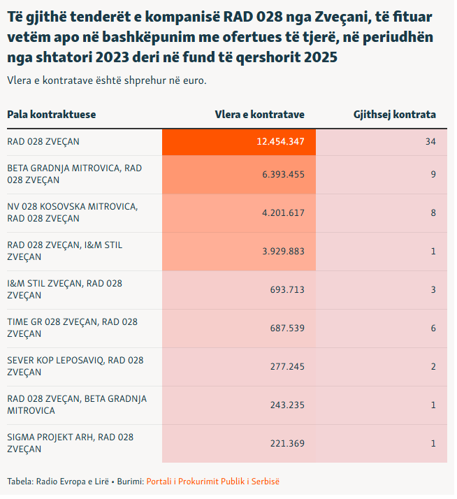 Kështu, përmes programeve të ndryshme nxitëse në tre vjetët e fundit, prokurimi i mallrave me vlerë më shumë se 8.5 milionë euro iu besua kompanisë “Rad 028” nga Zveçani dhe më vonë asaj “NV 028” nga Mitrovica e Veriut.