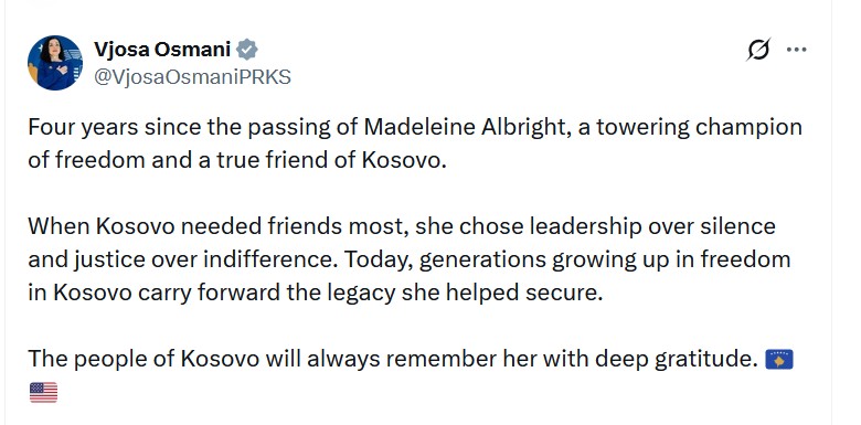 Përmes një postimi në platformën X, Osmani ka thënë se kur Kosovës i duheshin më së shumti miq, Albright zgjodhi udhëheqjen në vend të heshtjes dhe drejtësinë në vend të indiferencës.