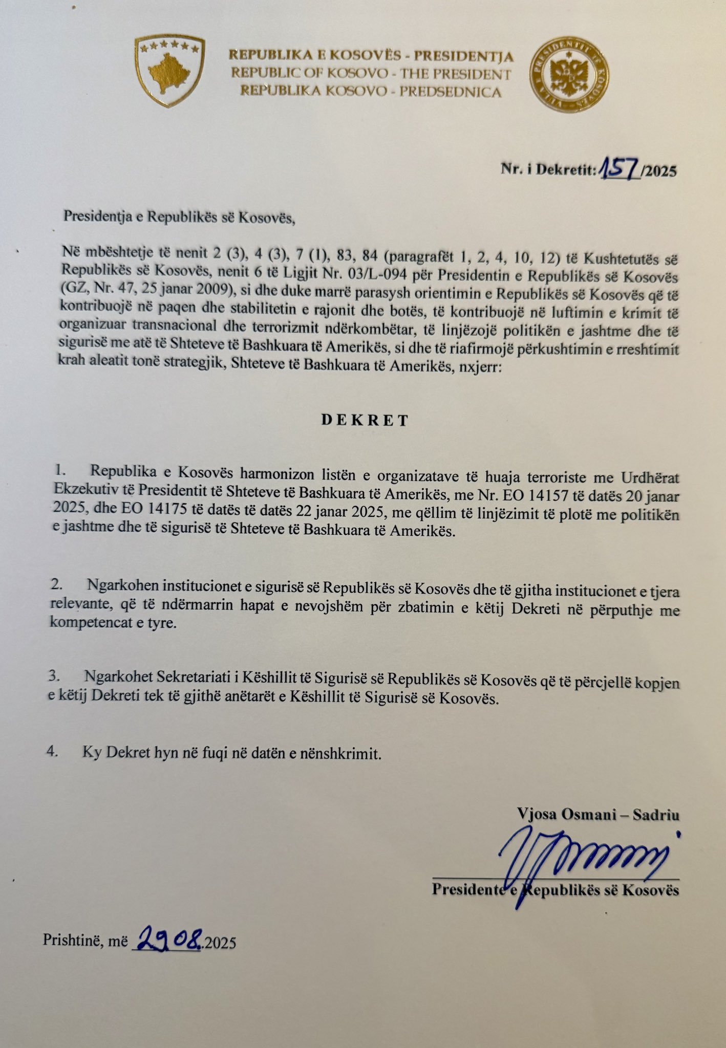Sipas një dekreti të lëshuar nga Osmani, Kosova do të përputhet plotësisht me Urdhëresat Ekzekutive të Presidentit Donald Trump të janarit 2025, të cilat shpallin disa kartelë ndërkombëtarë droge dhe organizata të tjera kriminale si organizata terroriste të huaja.