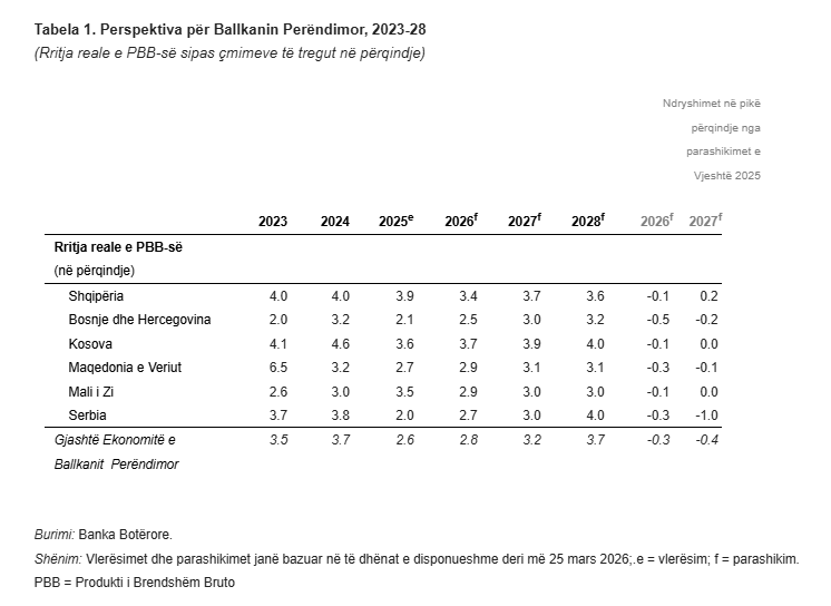 Rritja ekonomike në Ballkanin Perëndimor pritet të mbetet e moderuar gjatë viteve 2026 dhe 2027, e ndikuar nga pasiguritë globale, tensionet gjeopolitike, inflacioni i vazhdueshëm dhe efektet e konflikteve ndërkombëtare, thuhet në Raportin e Rregullt Ekonomik të Bankës Botërore për rajonin.