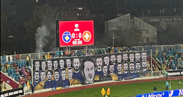 Këtë koreografi, tifozët e Kosovës e kanë shpalosur në ndeshjen Kosovë – Zvicër, që po zhvillohet në stadiumin “Fadil Vokrri”.