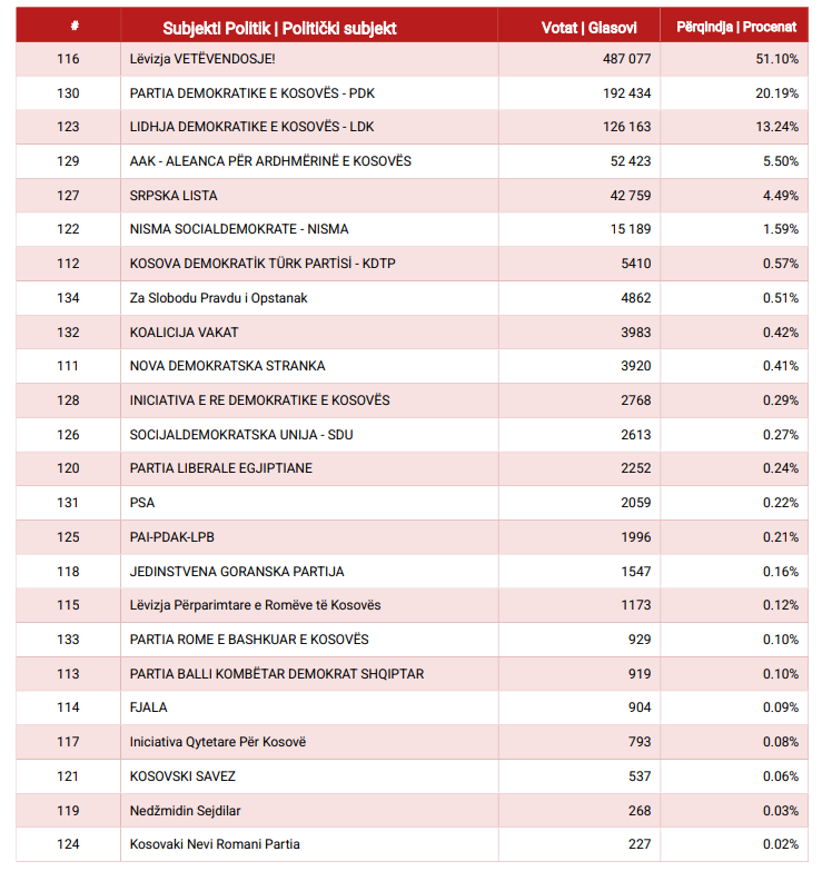Lëvizja Vetëvendosje ka marur 51.10%, Partia Demokartike e Kosovës 20.19%, Lidhja Demokratike e Kosovës 13.24 dhe Aleanca për Ardhmëri të Kosovës 5.50.