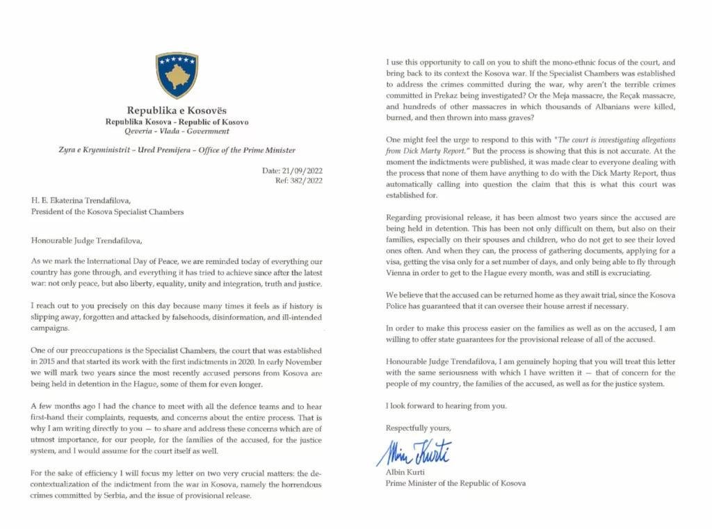 E si Kryeministër, zyra ime dhe unë kemi kërkuar lirimin e tyre që nga fillimi. Në vijim po bashkëngjes letrën që i është dërguar drejtpërdrejt znj. Trandafilova në lidhje me këtë çështje në shtator të vitit 2022. E bëj publike sot për një arsye të vetme: sepse besoj se është e drejtë që ata të kthehen në shtëpitë e tyre, të jenë pranë familjeve të tyre, dhe ta mbrojnë në liri luftën e drejtë çlirimtare të Kosovës. Përgjigja e znj. Trandafilova pas dy javësh që mori letrën nga unë nuk ndryshoi gjë. Kërkesat e paraqitura nuk morën zgjidhje.Kërkesat tona qëndrojnë akoma, e në Kosovë ekzistojnë të gjitha garancitë për përgjigje pozitive ndaj tyre.