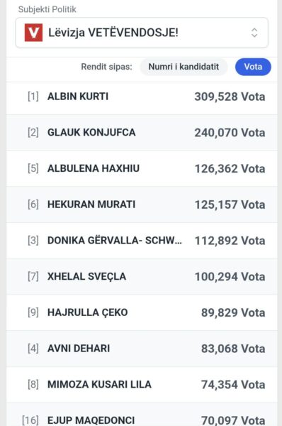 Në Lëvizjen Vetëvendosje prin Albin Kurti me 309,828 vota.