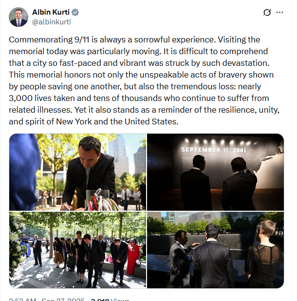 Në këtë vizitë, Kurti u shpreh se përkujtimi i 11 Shtatorit mbetet një përvojë e dhimbshme.