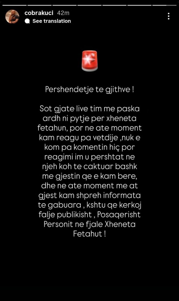 Pas shpërthimit të reagimeve në rrjete sociale, Edi vendosi të sqarojë situatën. Në një postim në Instagram, ai kërkoi falje publike për keqkuptimin e krijuar, duke theksuar se veprimi nuk kishte qenë i qëllimshëm.