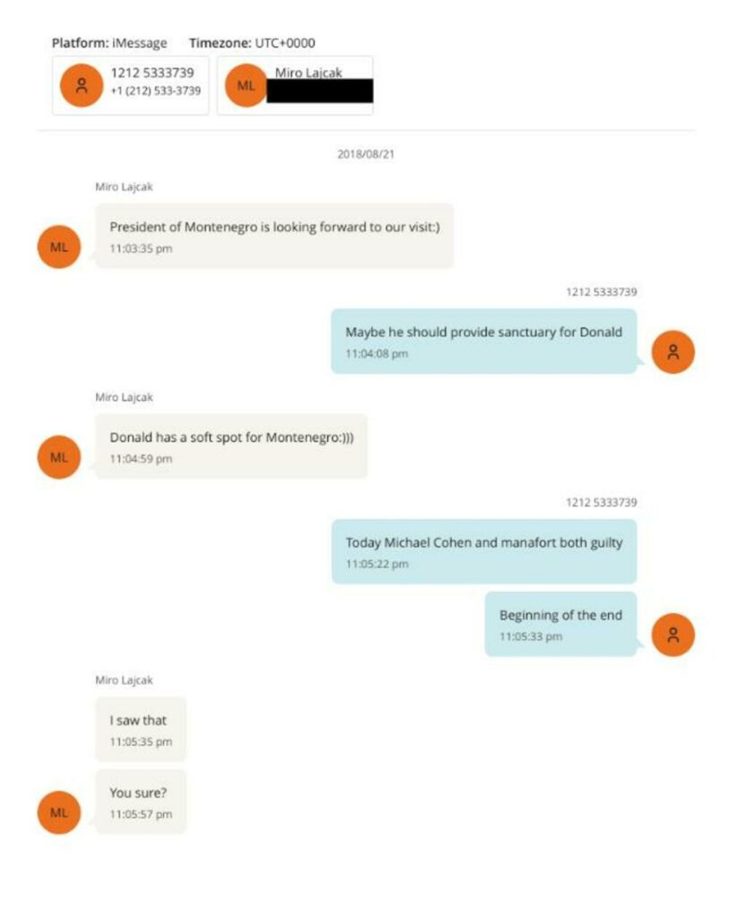 Më pas, Epstein i shkruan Lajçakut se ish-avokati i presidentit të Shteteve të Bashkuara, Donald Trump, Michael Cohen, dhe ish-këshilltari i Trumpit, Paul Manafort, “të dy janë fajtorë”, duke shtuar “fillimi i fundit”.