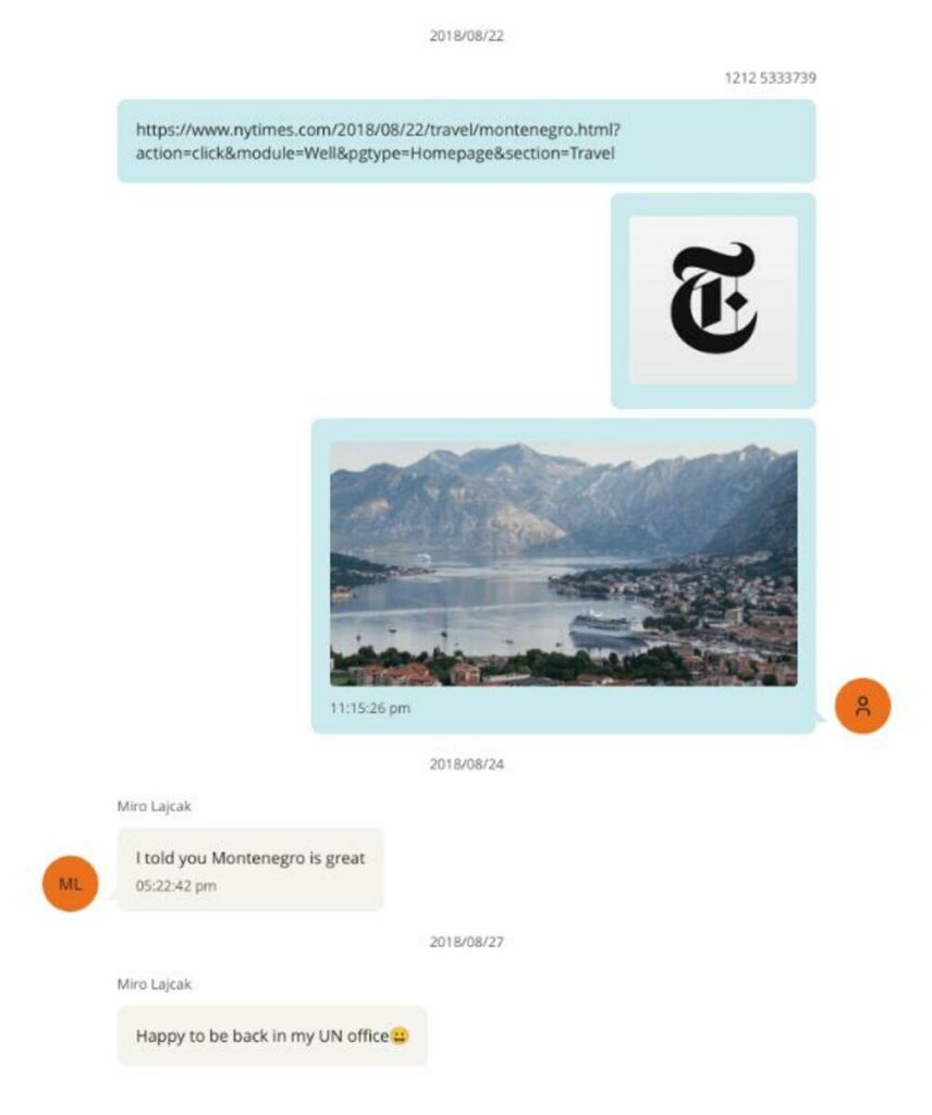 Gjatë bisedës, Epstein i dërgon Lajçakut edhe një link nga New York Times me një tekst për Malin e Zi dhe një fotografi të Kotorrit, ndërsa Lajçak i përgjigjet: “Ta thashë që Mali i Zi është fantastik”.