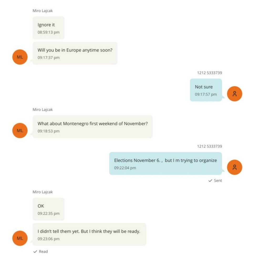 Në vazhdimin e bisedës, Lajçak e pyet Epsteinin: “Çfarë po ndodh me vizitën në Mal të Zi fundjavën e parë të nëntorit?”, ndërsa Epstein i përgjigjet: “Zgjedhjet janë më 6 nëntor, por po përpiqem ta organizoj”.