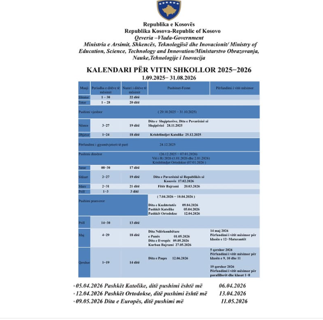 “Kalendari i vitit te ri shkollor gjithashtu përcakton pushimet vjeshtore, dimërore dhe pranverore, si dhe festat zyrtare, për të siguruar një planifikim të qartë e të strukturuar për nxënësit dhe mësimdhënësit.MAShTI shpreh falënderim për anëtarët e grupit punues, të përbërë nga mësimdhënës, përfaqësues të Drejtorive Komunale të Arsimit, të shkollave dhe të vetë Ministrisë, për punën dhe angazhimin e tyre në hartimin e këtij dokumenti gjithëpërfshirës”, thuhet në njoftim.