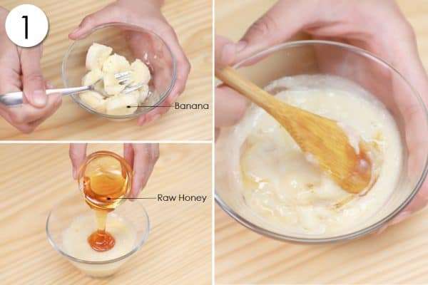 Shtypeni bananen me një piru. Shtoni më pas dy lugë gjelle mjaltë.