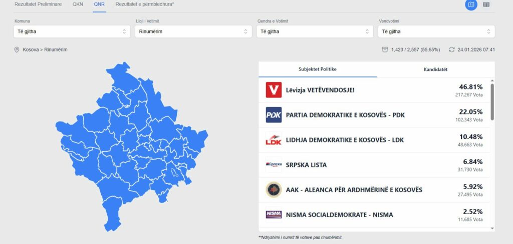 Sipas të dhënave të përditësuara nga KQZ, deri më tani janë rinumëruar mbi 55.65 për qind e fletëvotimeve, përcjell Klankosova.tv.