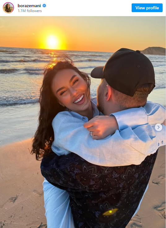 Të dy janë parë të përqafuar fort, ndërsa shijojnë perëndimin e diellit, një simbol universal i dashurisë dhe qetësisë shpirtërore. Pamja piktoreske e detit në sfond, ngjyrat e ngrohta të qiellit që shkrihen me ujërat e kaltërta, si dhe buzëqeshjet e tyre të ndritshme, krijojnë një tablo të paharrueshme për fansat.