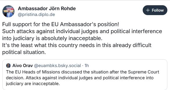 Ambasadori i Gjermanisë në Kosovë, Jörn Rohde, ka shprehur mbështetje ndaj deklaratës së ambasadorit të Bashkimit Evropian në Kosovë, Aivo Orav, lidhur me ndërhyrjet politike në sistemin gjyqësor dhe sulmet ndaj gjyqtarëve individualë pas vendimit të Gjykatës Supreme për çështjen e fiskalizimit.