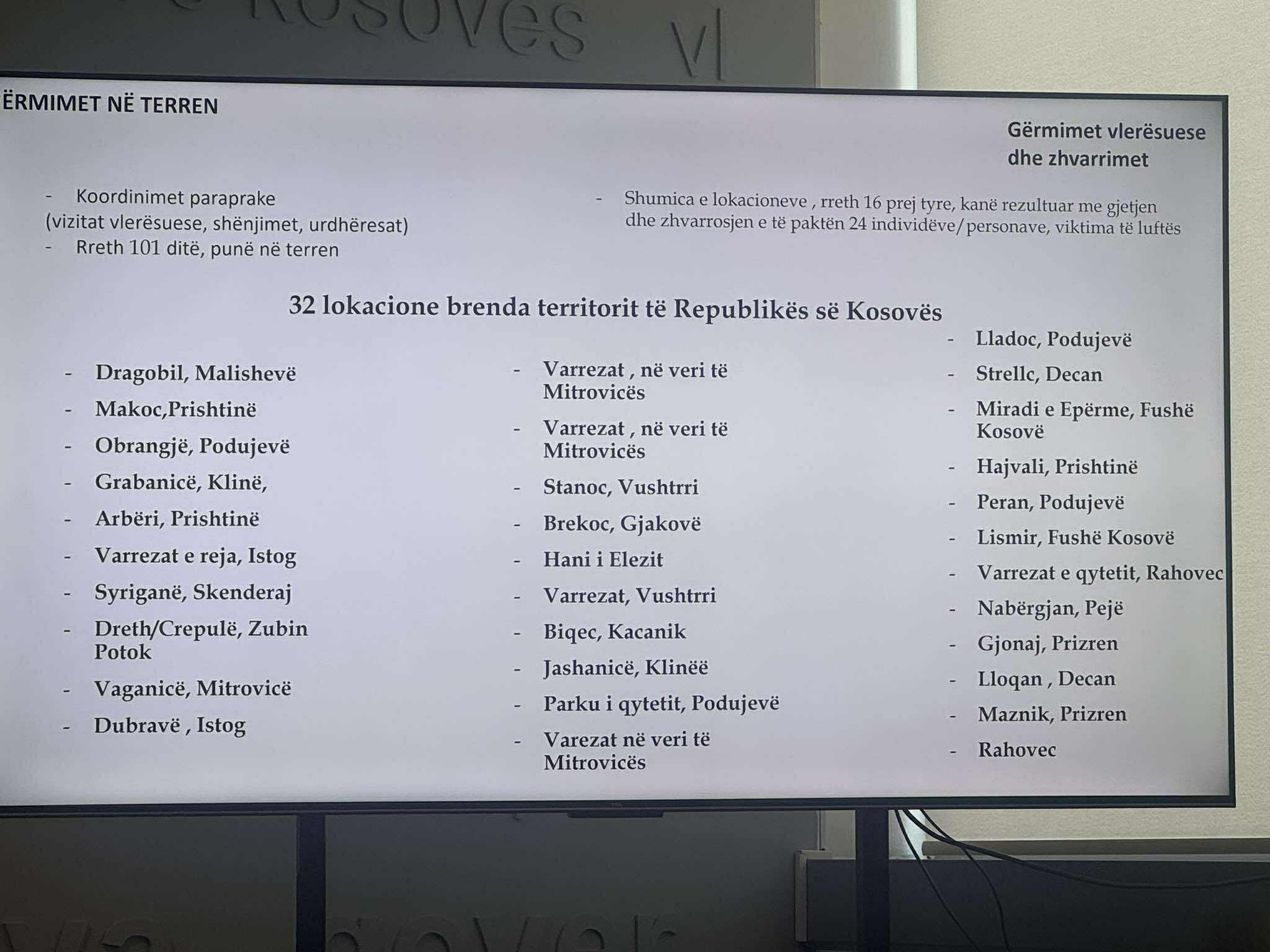 Gjatë vitit 2025, në Kosovë janë kryer gërmime në 32 lokacione ku dyshohej për persona të zhdukur gjatë luftës. Në 16 prej tyre janë gjetur mbetje mortore, në 15 lokacione nuk është gjetur asgjë, ndërsa një lokacion është vlerësuar se nuk ka qenë i interesit, ka njoftuar Komisioni Qeveritar për Persona të Zhdukur gjatë prezantimit të raportit vjetor të punës.