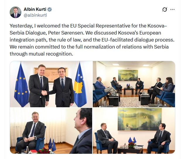 “Dje, prita Përfaqësuesin Special të BE-së për Dialogun Kosovë-Serbi, Peter Sørensen. Diskutuam për rrugën e integrimit evropian të Kosovës, sundimin e ligjit dhe procesin e dialogut të lehtësuar nga BE-ja. Ne mbetemi të përkushtuar për normalizimin e plotë të marrëdhënieve me Serbinë përmes njohjes reciproke”, ka shkruar Kurti.