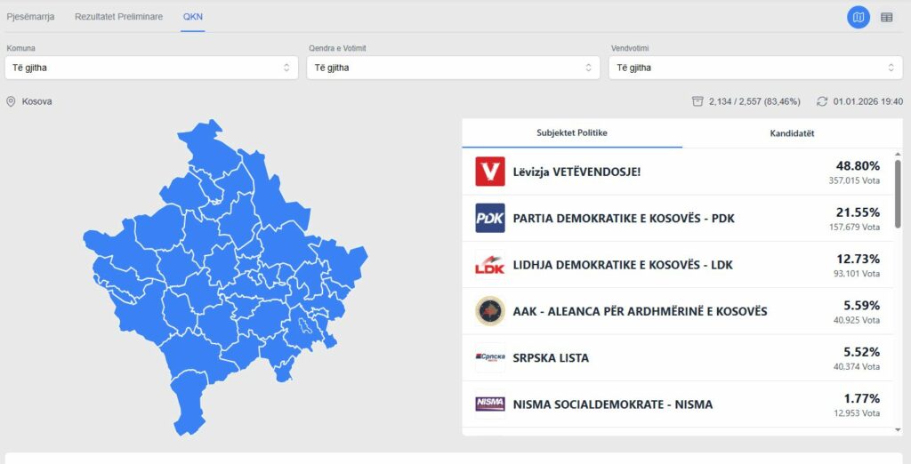 Deri në ora 19:40, sipas të dhënave të KQZ-së, janë procesuar 83.46% të votave.