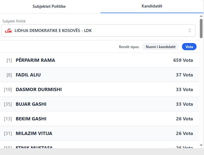 Deri tani janë procesuar rezultatet për dy vendvotime. LDK ka deri tash 300 vota, e ndjekur nga VV me 197 dhe PDK me 187.