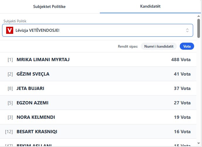 Nga VV i pari renditet Mrika Limani Myrtaj si bartëse liste me 488 vota. Pas saj është Gëzim Sveçla me 41 vota, Jeta Bujari 37 vota, Egzon Azemi me 27 e Nora Kelmendi me 19 vota.