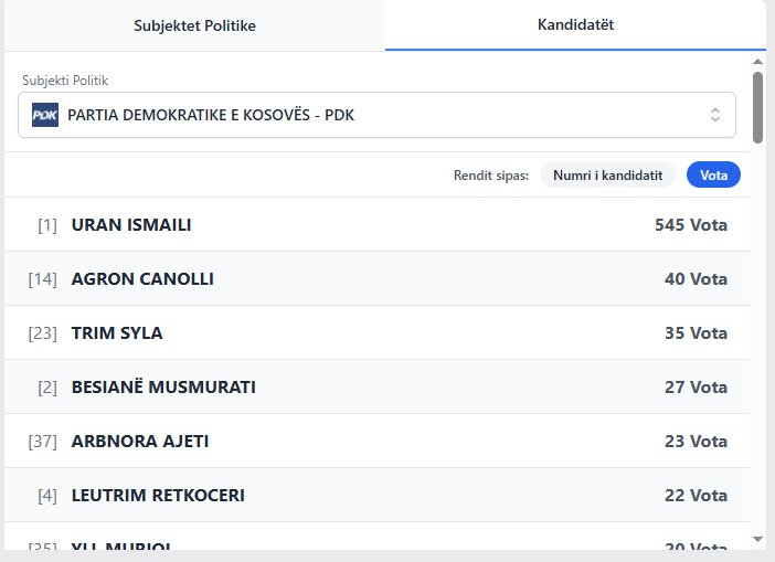 Nga PDK prinë Uran Ismaili me 545 vota, Agron Canolli me 40 vota, Trim Syla 35 vota pasuar me Besian Musmurati me 27 vota.