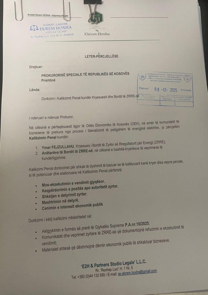 Oda Ekonomike e Kosovës (OEK) ka dorëzuar të hënën në Prokurorinë Speciale një padi kundër rregullatorit të energjisë në vend, Zyrës së Rregullatorit për Energji, duke e akuzuar për disa shkelje, përfshirë “moszbatimin” e vendimit të Gjykatës Supreme lidhur me tregun e lirë të energjisë.