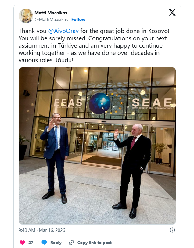 “Falënderoj Aivo Orav për punën e shkëlqyer në Kosovë. Kontributi yt ka qenë shumë i rëndësishëm dhe do të mungosh. Të uroj suksese në detyrën e re në Turqi dhe pres të vazhdojmë bashkëpunimin tonë siç kemi bërë ndër vite në role të ndryshme”, ka shkruar Maasikas.